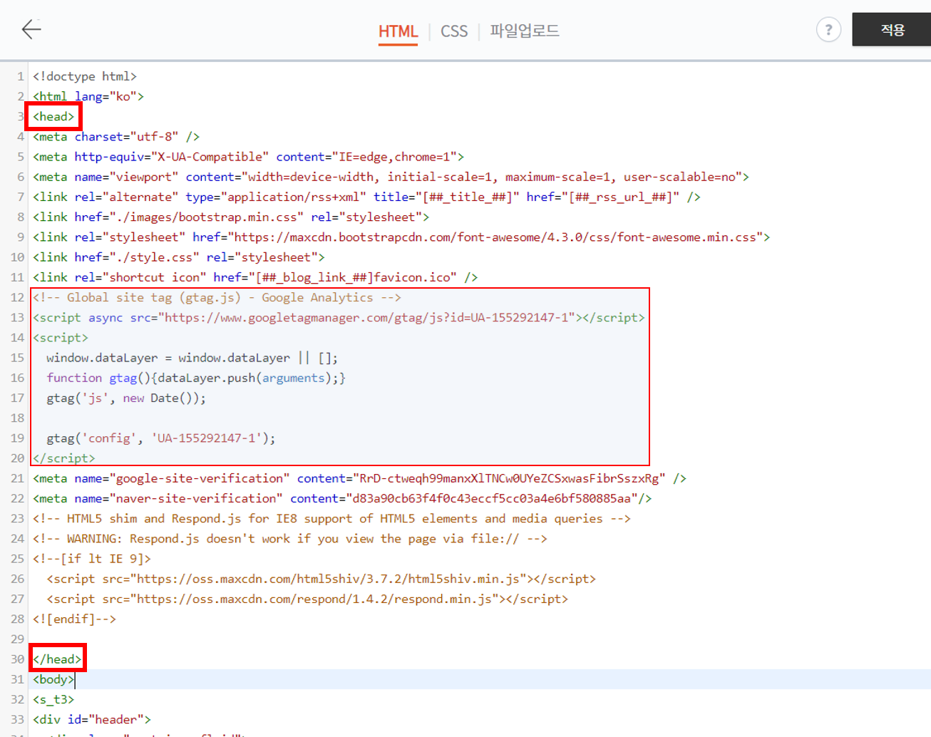 발급받은 추적 코드를 html 내 <head>와 </head> 사이에 심기!